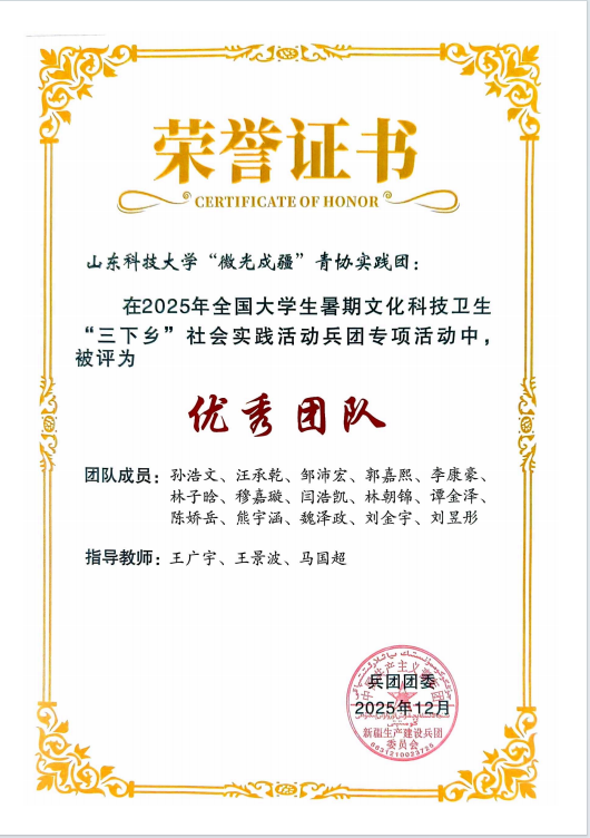 近日,2025年全國大學生暑期文化科技衛(wèi)生“三下鄉(xiāng)”社會實踐“衛(wèi)國戍邊兵團行”兵團專項活動順利結項。由濟南校區(qū)師生組成的山東科技大學“微光戍疆”青協(xié)實踐團(指導教師:王廣宇、王景波、馬國超)成為學校首次入選該專項活動的團隊,并在全國高校152支入選實踐隊伍中脫穎而出,榮獲“優(yōu)秀團隊”榮譽稱號。實踐團圍繞“青春助力兵地融合,數字賦能鄉(xiāng)村振興”為主題,深入新疆生產建設兵團基層一線開展調研實踐,形成了一系列具有現實針對性和實踐價值的成果,充分展現了濟南校區(qū)在社會實踐和實踐育人方面的扎實成效。