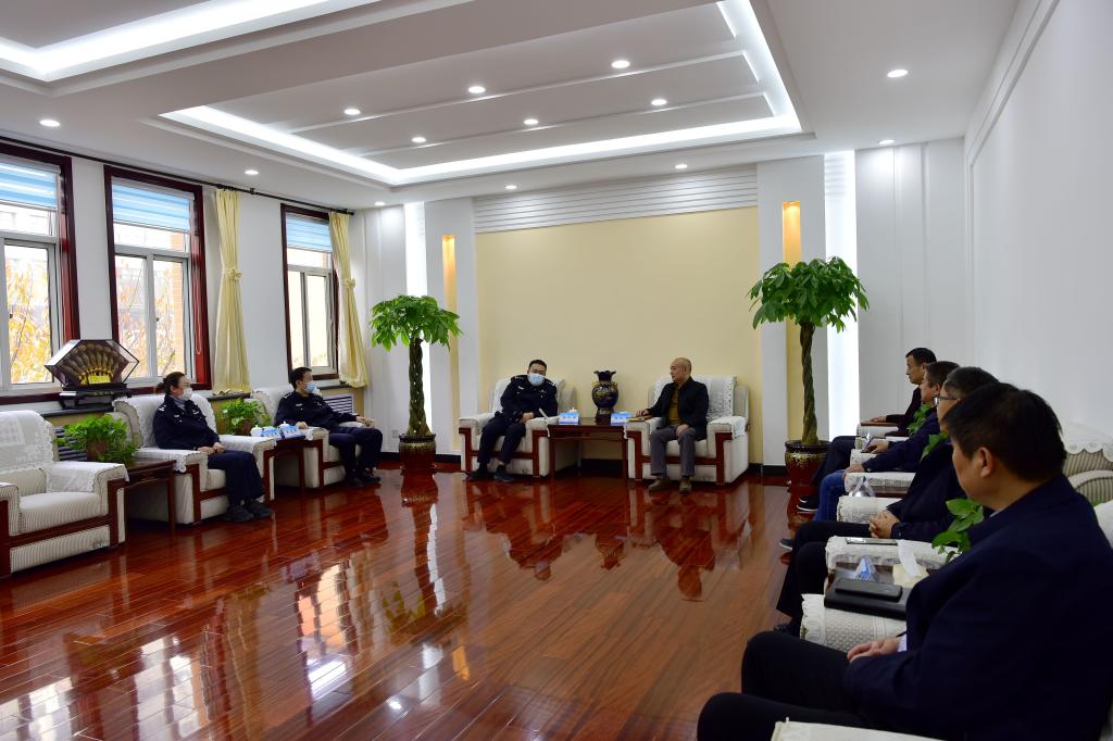 郭加書對(duì)楊令宇一行表示熱烈歡迎,對(duì)天橋警方長(zhǎng)期以來給予校區(qū)安全穩(wěn)定工作的大力支持和幫助表示感謝,介紹了學(xué)校的發(fā)展歷史與現(xiàn)狀、濟(jì)南校區(qū)的功能定位與辦學(xué)特色、校區(qū)學(xué)生安全教育管理的做法和成效,希望警校加強(qiáng)溝通交流,進(jìn)一步建立健全聯(lián)防聯(lián)動(dòng)機(jī)制,共同維護(hù)師生的健康平安和校園的安全穩(wěn)定,助力“平安濟(jì)南” “平安天橋”建設(shè)。楊令宇對(duì)學(xué)校及校區(qū)的發(fā)展成就表示贊賞,交流了“平安濟(jì)南” “平安天橋”建設(shè)情況,通報(bào)了駐濟(jì)學(xué)校特別是高校學(xué)生安全形勢(shì)與狀況,表示要加強(qiáng)與校區(qū)的交流溝通,更好地為學(xué)校的發(fā)展與人才培養(yǎng)提供安全環(huán)境保障。