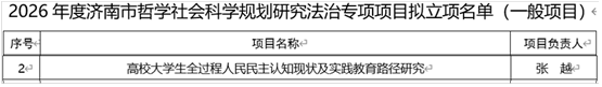 近日,濟(jì)南市哲學(xué)社會(huì)科學(xué)工作辦公室公布了2026年度法治專項(xiàng)項(xiàng)目立項(xiàng)名單,張?jiān)缴陥?bào)的《高校大學(xué)生全過程人民民主認(rèn)知現(xiàn)狀及實(shí)踐教育路徑研究》成功獲批。